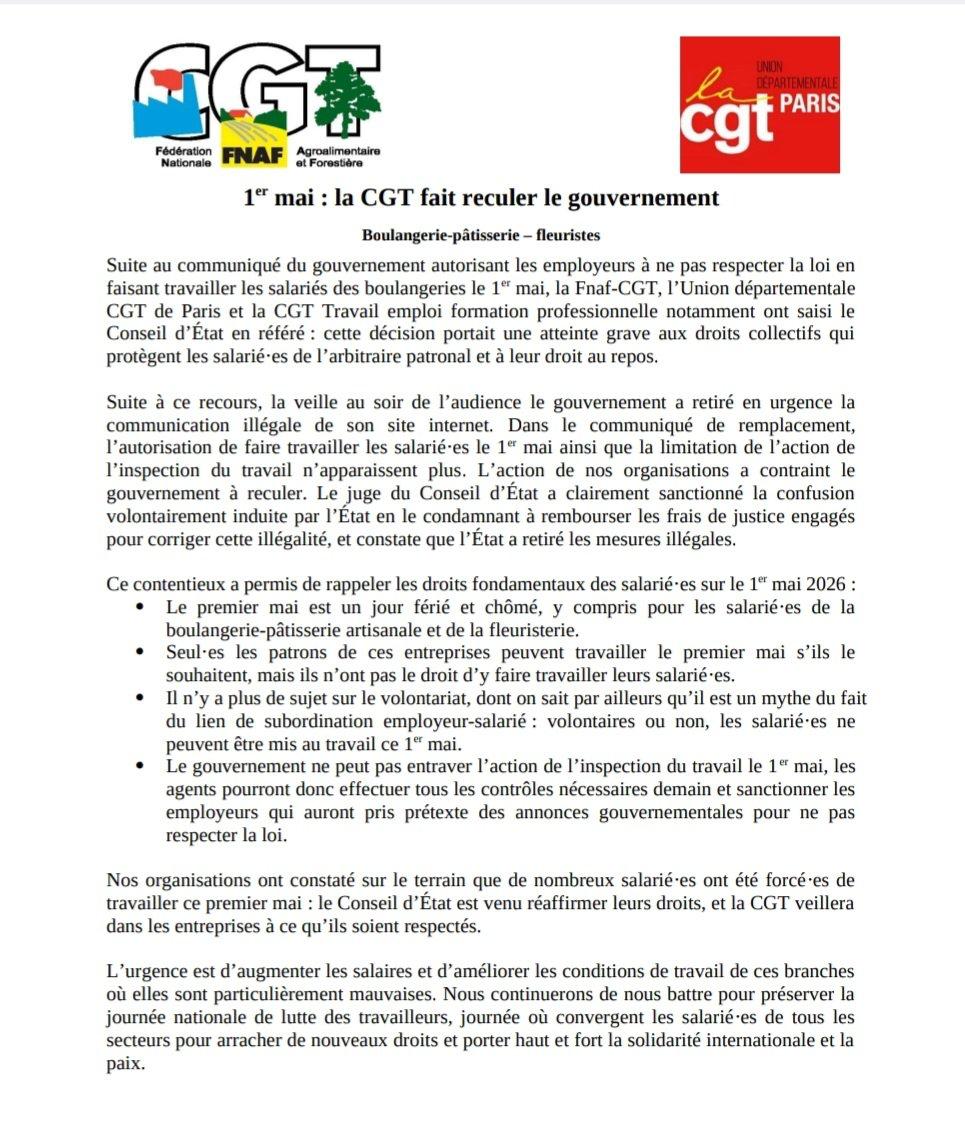 1er mai : nouveau recul du gouvernement Posté dans A la une, droit du travail le 30 avril 2026 par syndicoAdmin. Suite aux référés déposés par les syndicats, le gouvernement retire sa circulaire autorisant certains patrons à ne pas respecter le droit du travail. More from my siteTous les syndicats fonction publique préparent l’action du 9 mai 2019L’activité internationale de la CGT et sa participation à la CSIFonction publique : un processus de mobilisationAssurance-chômage : réforme suspendue, pas annuléeLes huit syndicats appellent à renoncer aux « réformes » chômageRegain de mobilisations pour les droits des chômeurs