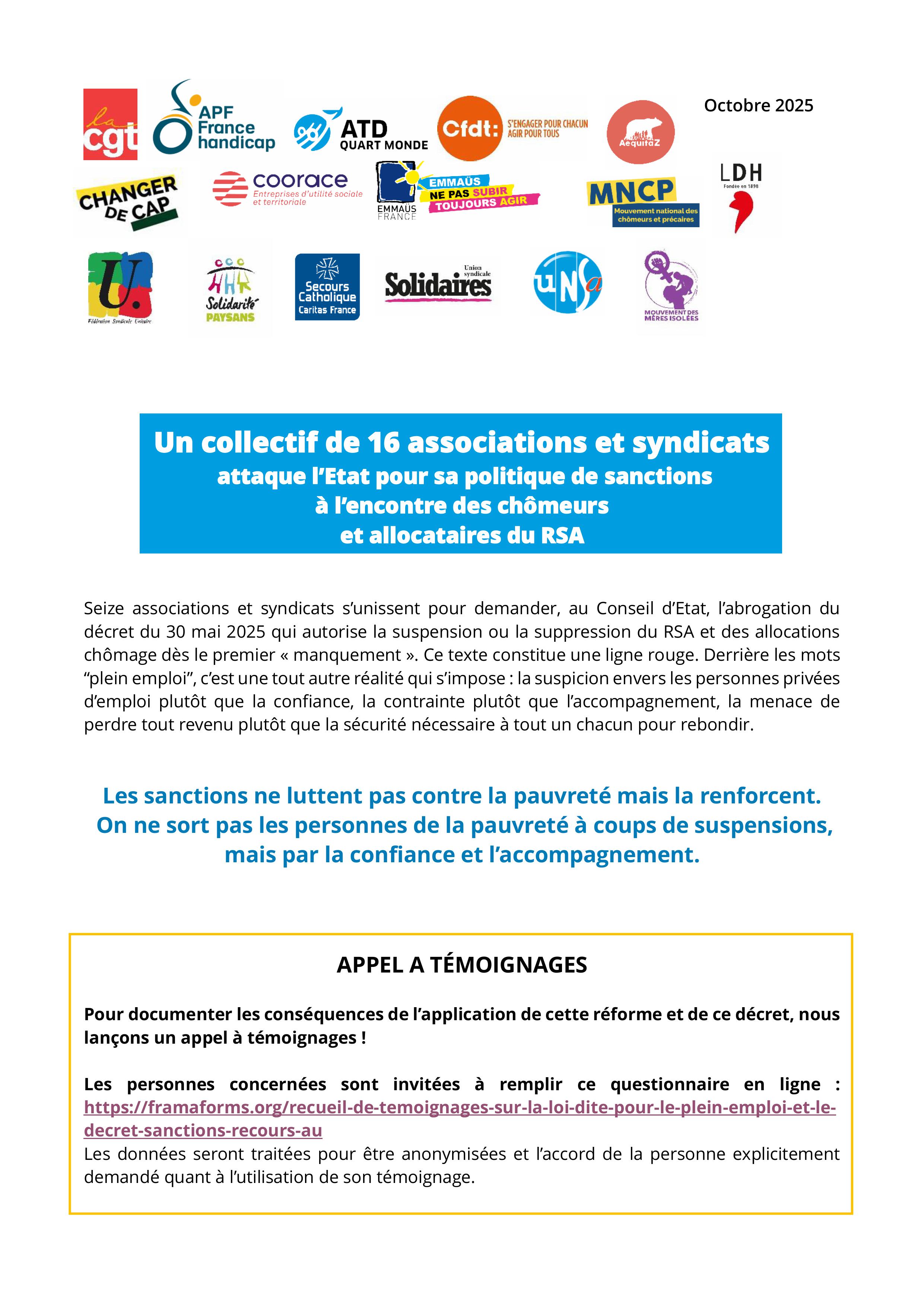 Un collectif de 16 associations et syndicats attaque l’Etat pour sa politique de sanctions à l’encontre des chômeurs et allocataires du RSA