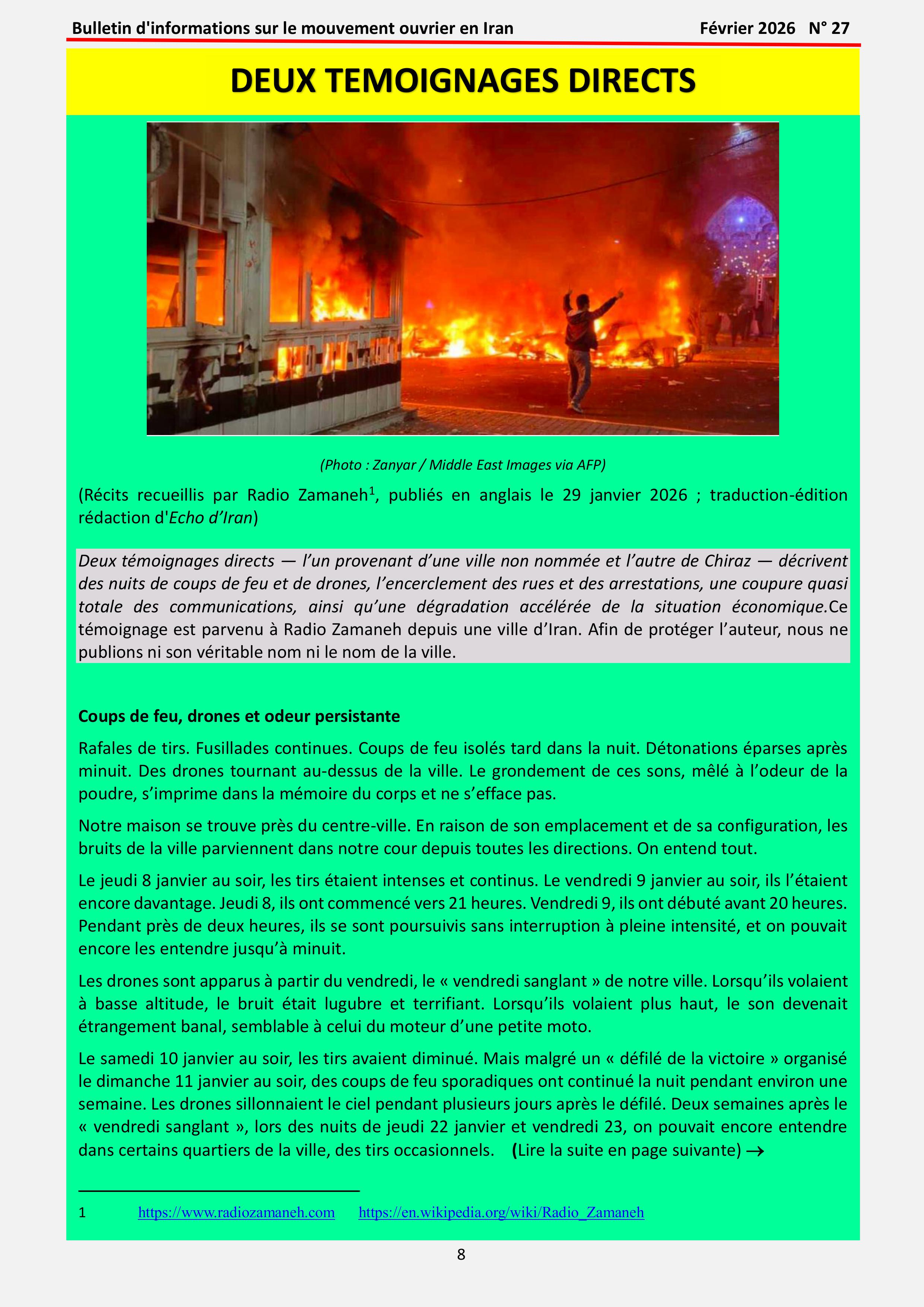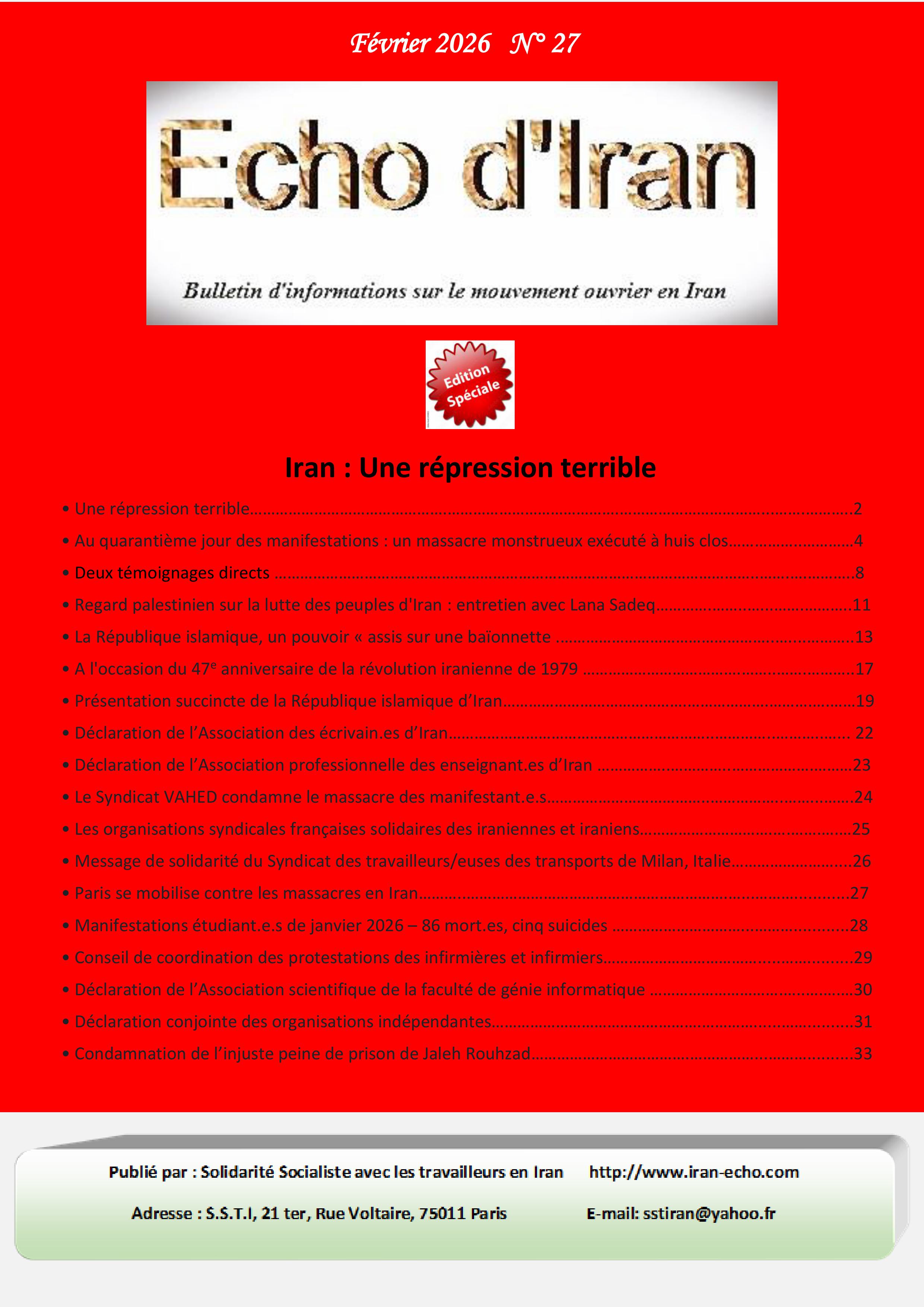 Les documents ci-dessous sont parus au début de février 2026, après la répression sanglante des peuples d’Iran contre la dictature. Ils sont extraits de Echo d’Iran, Bulletin d’information du mouvement ouvrier en Iran (N°27) dont nous donnons l’accès complet en téléchargement. Ce bulletin est publié par l’organisation Solidarité Socialiste avec les travailleurs en Iran (SSTI), dont une militante avait pris la parole au congrès CGT en 2023. Ces articles témoignent, à l’heure où le pays est cette fois sous les bombes de Trump et de Netanyahou de la vivacité des luttes syndicales, culturelles et des actes de résistance des peuples d’Iran.