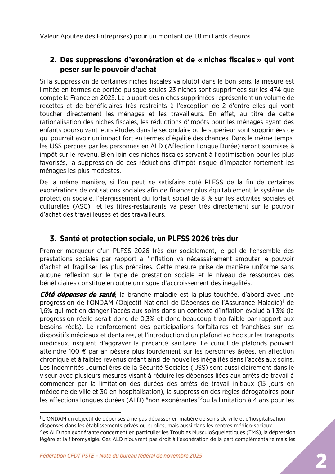 - La CFDT s’oppose en particulier aux dispositions relatives à la branche Maladie. Le niveau proposé pour l’objectif national des dépenses d’assurance maladie (Ondam) 2026 est irréaliste et renforcera la crise de l’hôpital public. Les efforts demandés sont déséquilibrés. Le report de la protection sociale complémentaire pour les agents de la fonction publique hospitalière est inacceptable. La CFDT dénonce une réforme du régime des ALD, la limitation des arrêts maladie, le doublement des franchises et l’extension de leur champ… À cela s’ajoute la limitation de la durée d’indemnisation des arrêts en cas d’accident du travail ou de maladie professionnelle. Socialement, c’est un texte très dur. Certes, il comprend aussi quelques avancées mais les efforts ne sont pas équitablement partagés. Ils ne touchent que les travailleurs, les retraités, les patients et les adhérents ou assurés des complémentaires santé.