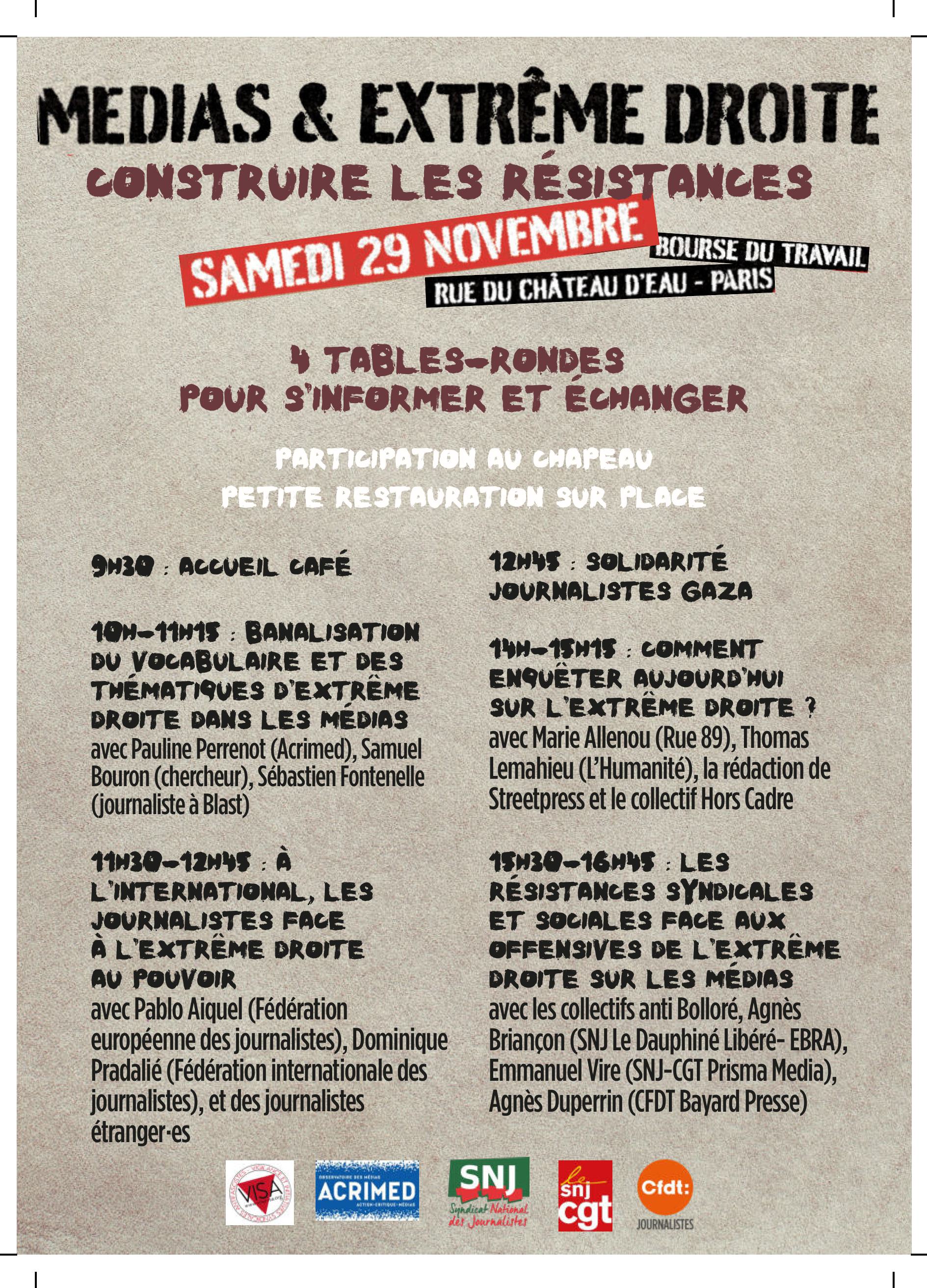 15h30 – 16h45 : LES RESISTANCES SYNDICALES ET SOCIALES FACE AUX OFFENSIVES DE L’EXTREME DROITE SUR LES MEDIAS avec les collectifs anti Bolloré, Agnès Briançon (SNJ Le Dauphiné Libéré-EBRA), Emmanuel Vire (SNJ-CGT Prisma Media), Agnès Dupérin (CFDT Bayard Presse)