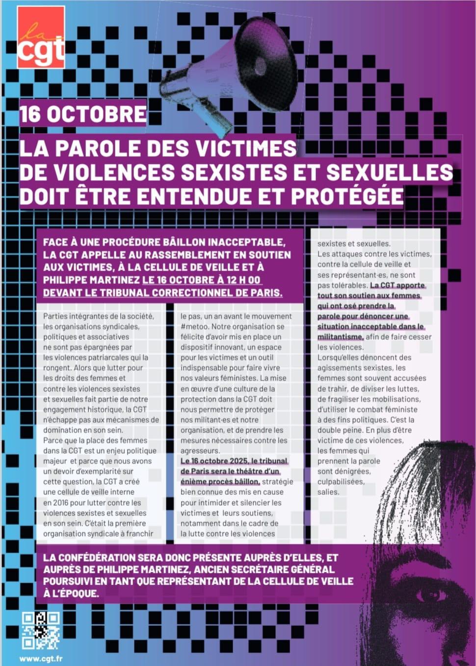 Nous, militantes syndicalistes et féministes, en appelons à votre solidarité et à votre soutien pour notre camarade Christine, qui passe en procès pour diffamation les 16 et 17 octobre 2025 à Paris. Un rassemblement aura lieu le 16 octobre à midi devant le tribunal.